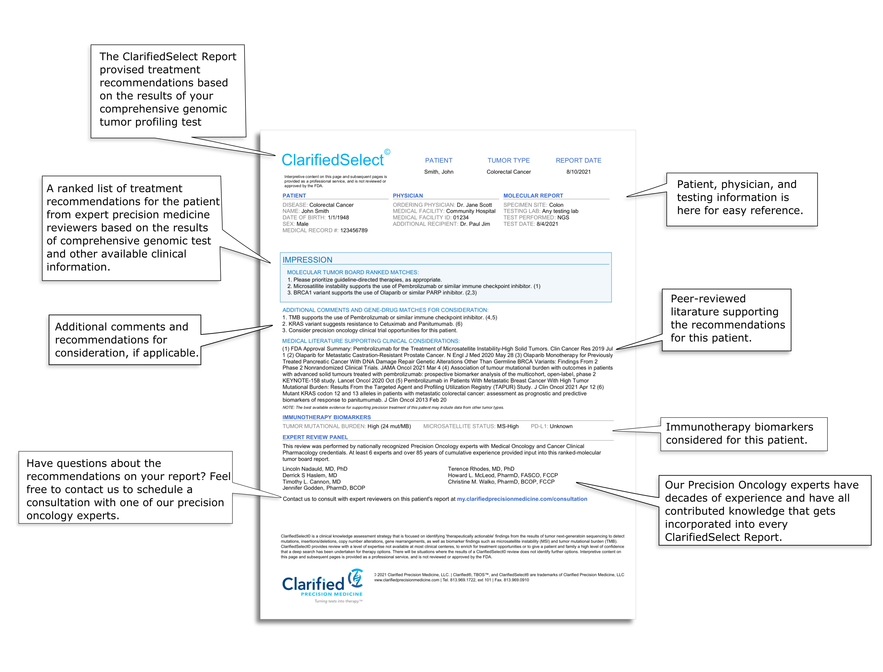 Standardize precision oncology output across testing platforms, clear ‘value-based’ medication selection (ask about Clarified Practice Revenue Calculator), efficient use of clinician time. Increased patient/family satisfaction.